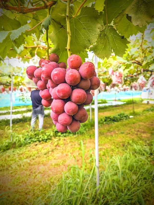 クインニーナは 果皮はきれいな赤色をしていて、粒の重さは平均約17gと大粒。果肉がしっかりしていて歯切れがよく、糖度が高くて酸味がおだやかです。また「巨峰」や「ピオーネ」のような香りがあり、甘くみずみずしいことが特徴となっています。皮は食べれませんが種無しです。